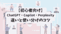 マインド 【初心者向け】ChatGPT・Copilot・Perplexity|違いと使い分けのコツ 「AIってChatGPT以外にもあるの?」「ChatGPTと他のAIってどう違うの?」僕も最初はそう思ってましたが、今では3つのAI(ChatGPT・Copilot・Perplexity)を使い分けています。どれも普段使いにおすすめのAIなので、それぞれの特徴を知っておくと日常生活がとても便利になりますよ~。ChatG... 2025.09.05 2025.09.14 マインド