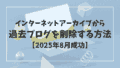 ブログ奮闘記 インターネットアーカイブから過去ブログを削除する方法【2025年8月成功】 「過去のブログがインターネットアーカイブに残っているのが気になる…」そんな方に向けて、インターネットアーカイブ(Internet Archive)から過去のブログ履歴を削除する方法」をこの記事で解説していきます。僕自身、とある事情で使わなくなったドメインの削除依頼を行い、2025年8月に1回で削除が成功しました!この記... 2025.08.24 2025.09.12 ブログ奮闘記